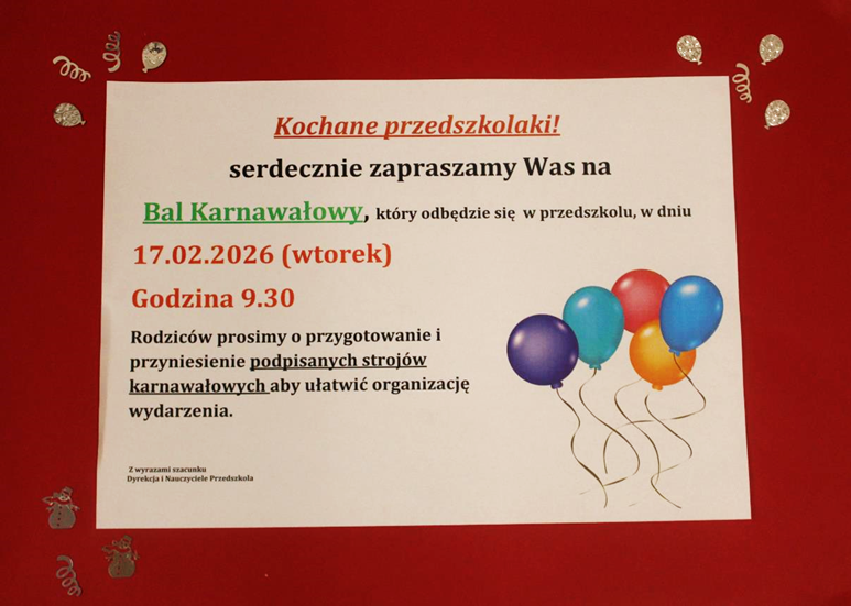 Już wkrótce w naszym przedszkolu odbędzie się wesoły Bal Karnawałowy, pełen muzyki, tańców, uśmiechu i wspaniałej zabawy!