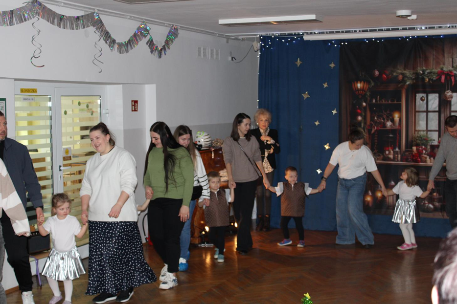 Już od pierwszych chwil panowała radosna atmosfera. Wszyscy bawili się w kole podczas zabawy „Wkoło choinki". Nie zabrakło piosenek i tańców w parach. „Malusieński Jezus" na kolanach u rodziców był wzruszającym momentem, a zabawa w „jazdę saniami" do piosenki „Pędzą sanie" wywołała wiele śmiechu. Spotkanie zakończyła opowieść „Bombeczka" czytana przez nauczycielkę i rodzica, a na dzieci czekały pierniczki.
