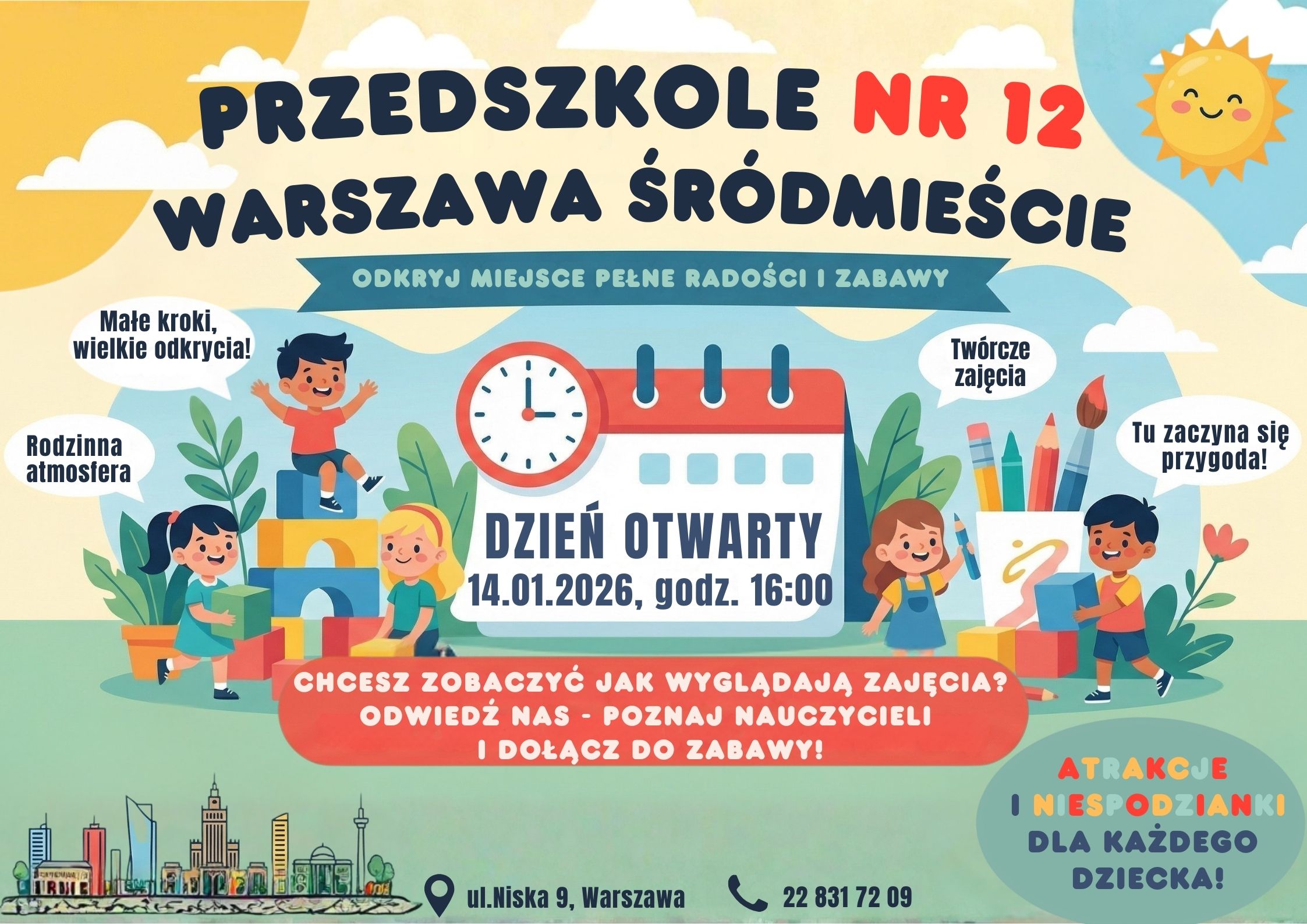 Serdecznie zapraszamy wszystkie Dzieci wraz z Rodzicami na Dzień Otwarty, który odbędzie się 14 stycznia (środa) o godzinie 16:00 w naszym przedszkolu przy ulicy Niskiej 9, 00-176 Warszawa.