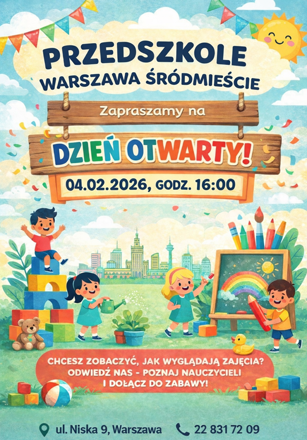 Serdecznie zapraszamy wszystkie Dzieci wraz z Rodzicami na Dzień Otwarty, który odbędzie się 14 stycznia (środa) o godzinie 16:00 oraz 4 lutego (środa) o godzinie 16:00 w naszym przedszkolu przy ulicy Niskiej 9, 00-176 Warszawa.