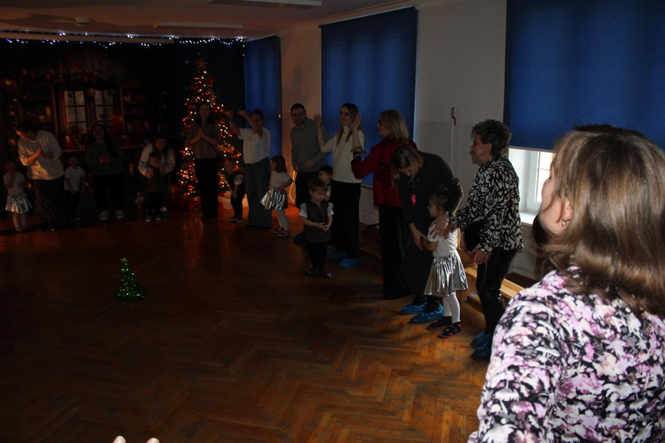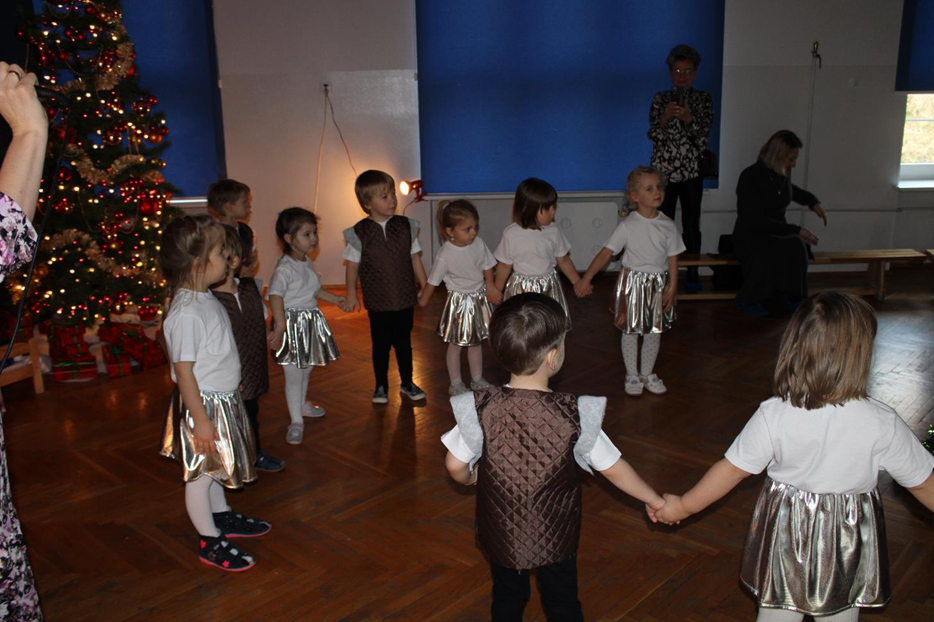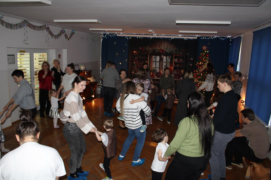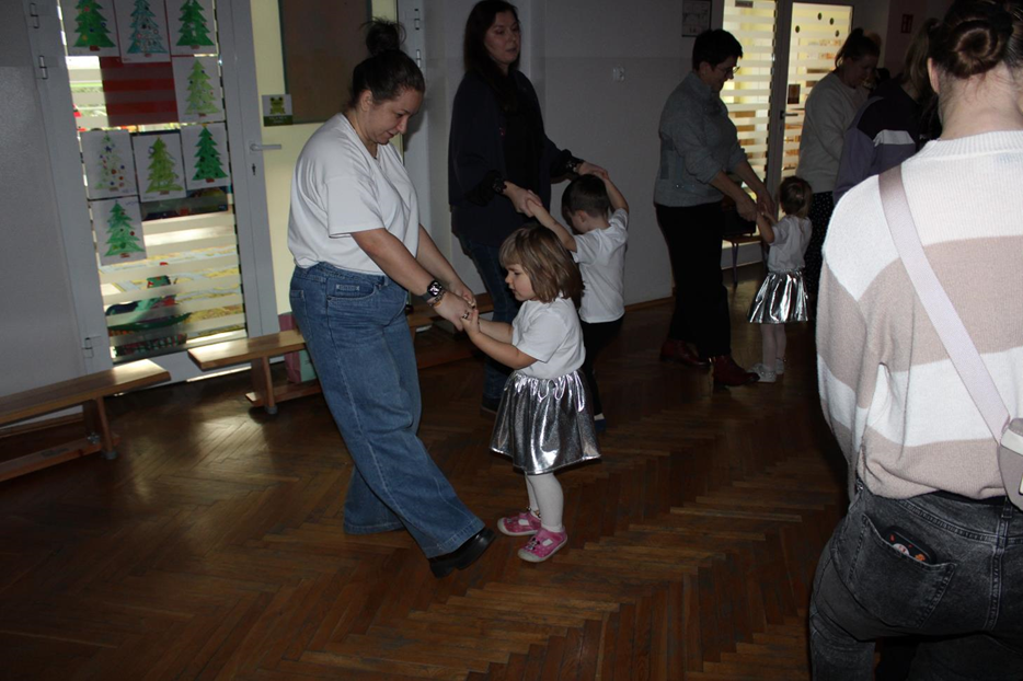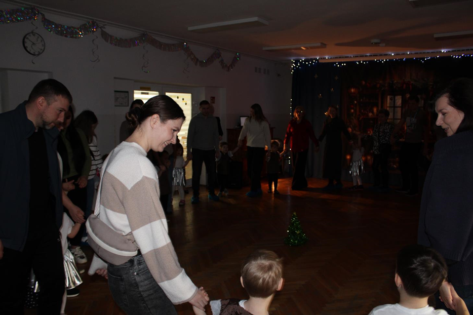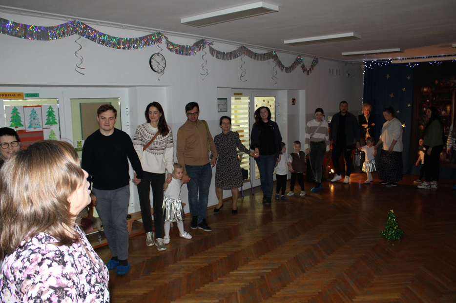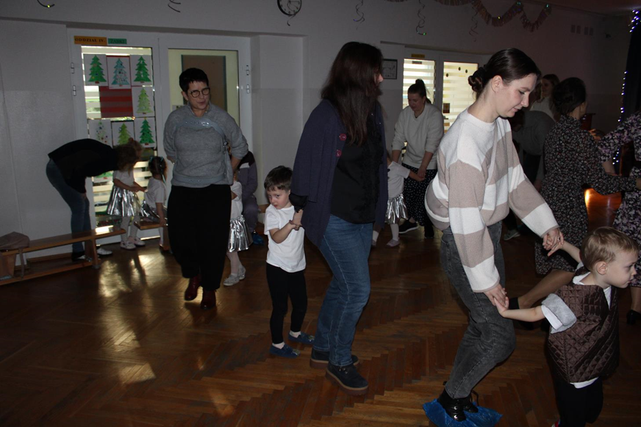 Już od pierwszych chwil panowała radosna atmosfera. Wszyscy bawili się w kole podczas zabawy „Wkoło choinki". Nie zabrakło piosenek i tańców w parach. „Malusieński Jezus" na kolanach u rodziców był wzruszającym momentem, a zabawa w „jazdę saniami" do piosenki „Pędzą sanie" wywołała wiele śmiechu. Spotkanie zakończyła opowieść „Bombeczka" czytana przez nauczycielkę i rodzica, a na dzieci czekały pierniczki.