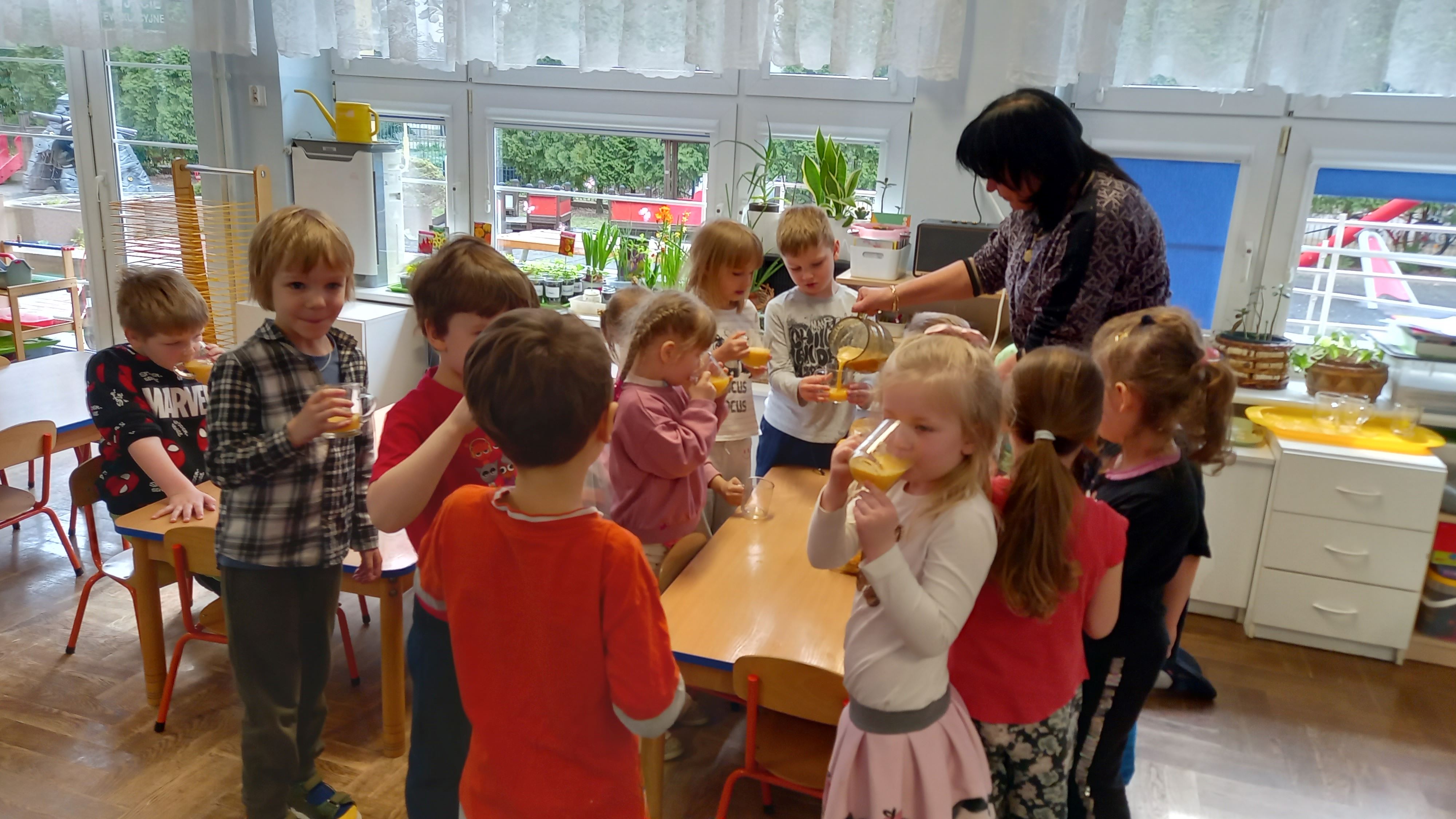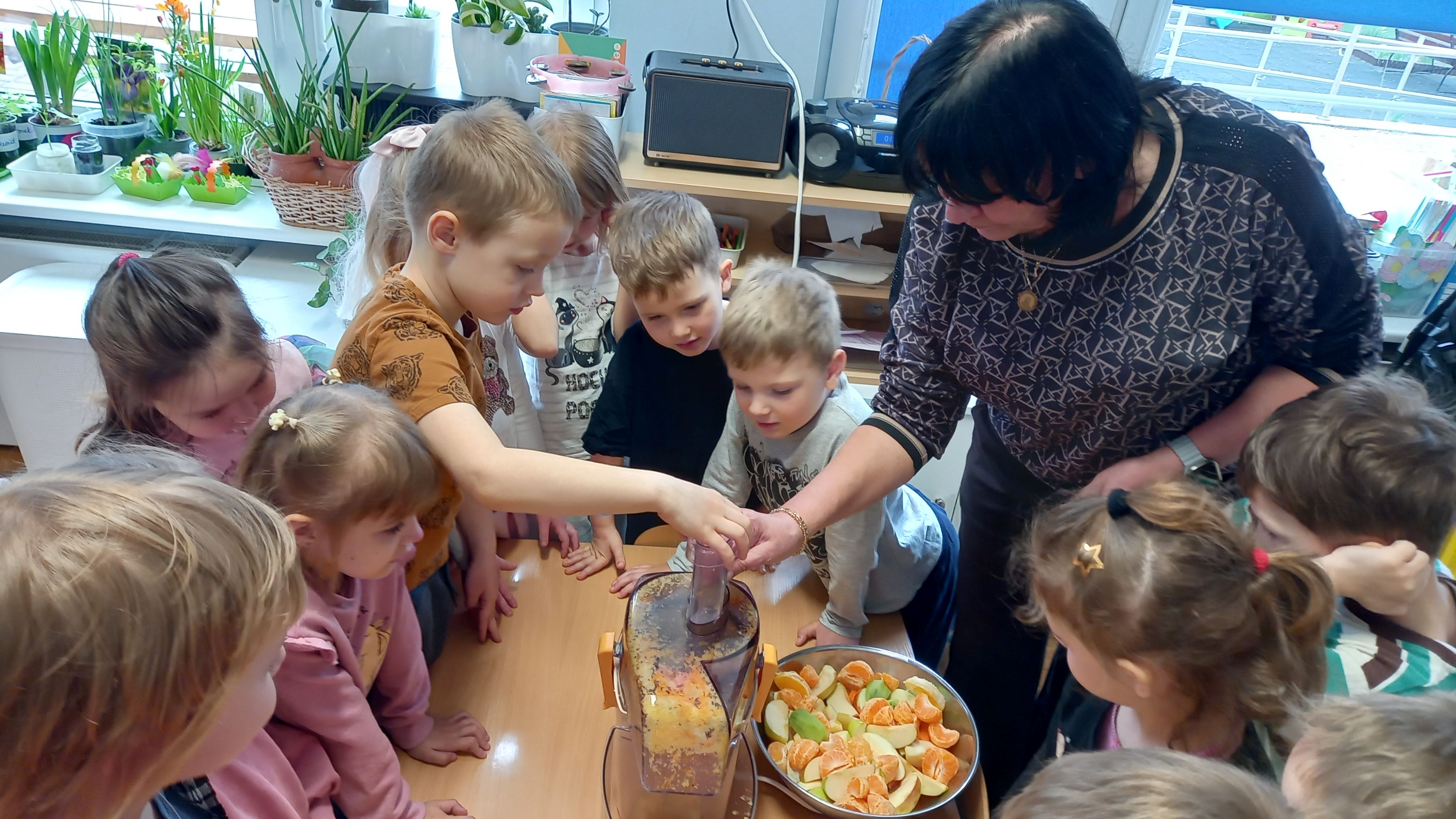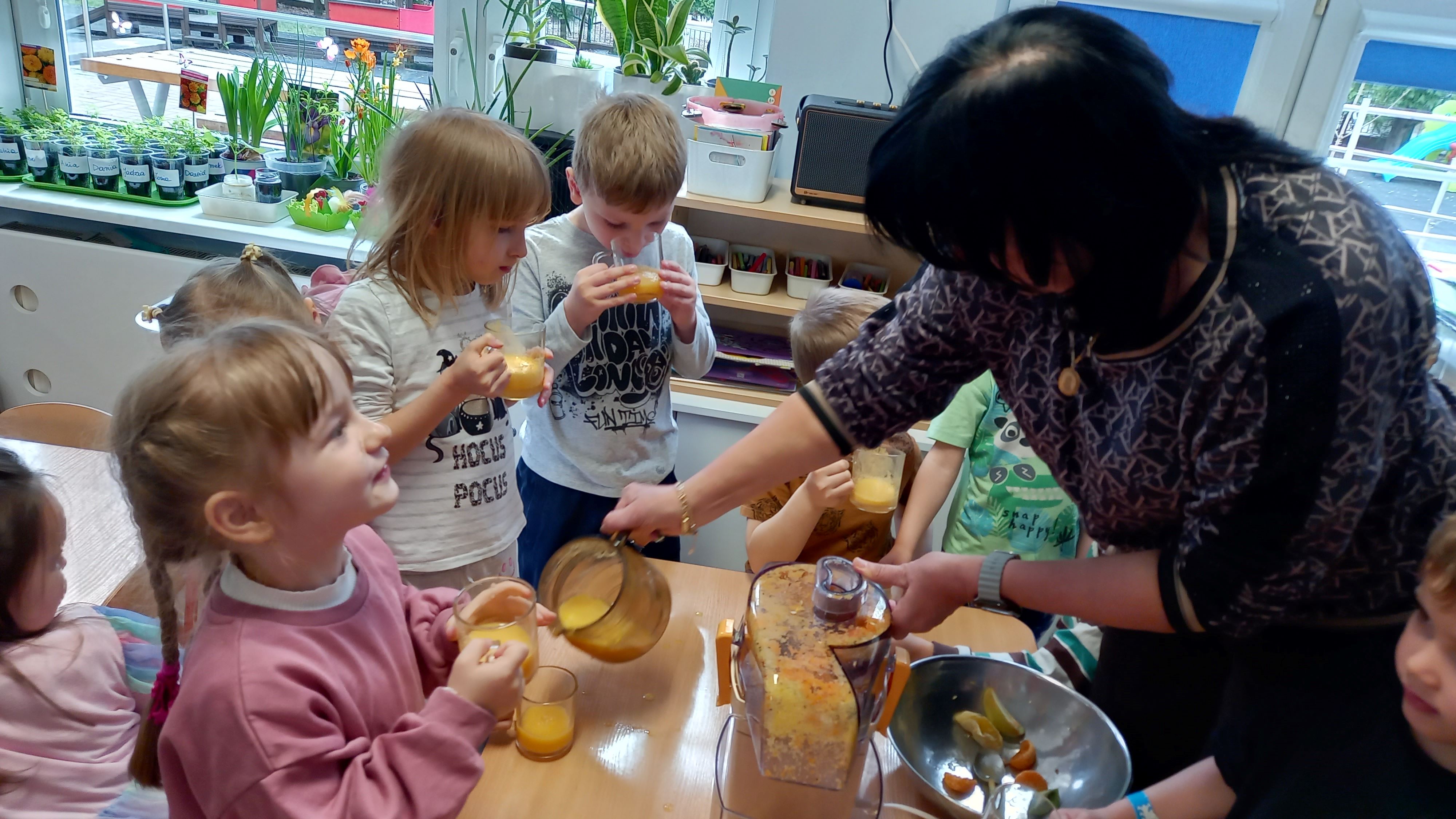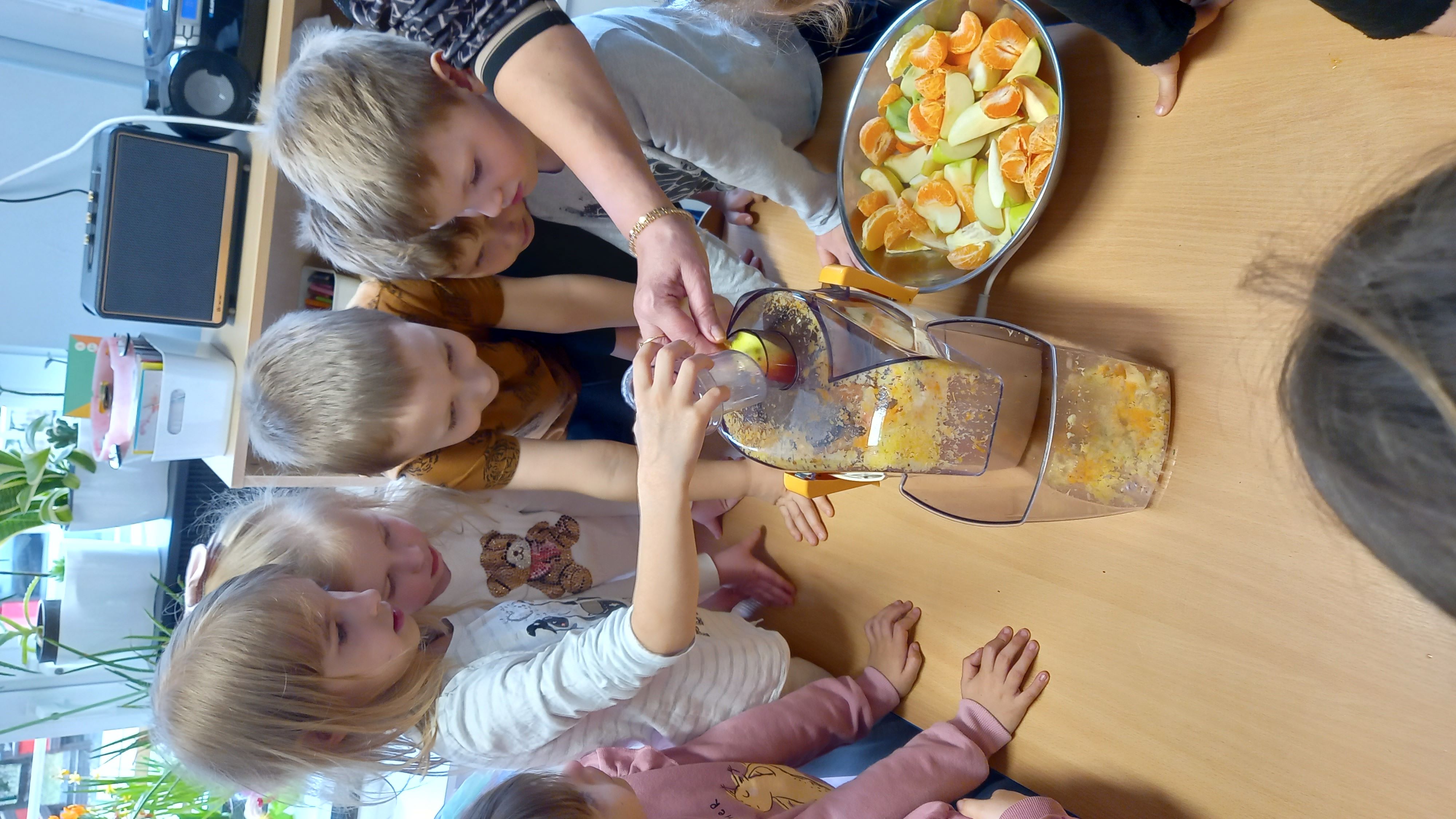 Największą atrakcją było jednak wspólne przygotowywanie świeżych soków owocowych. Z pomocą nauczycielki dzieci mogły obserwować cały proces - od wrzucania owoców do wyciskarki, po oglądanie jak powstaje pyszny sok. Kropelki chętnie pomagały, podawały składniki i z ogromnym zaciekawieniem patrzyły jak owoce zmieniają się w zdrowy napój.