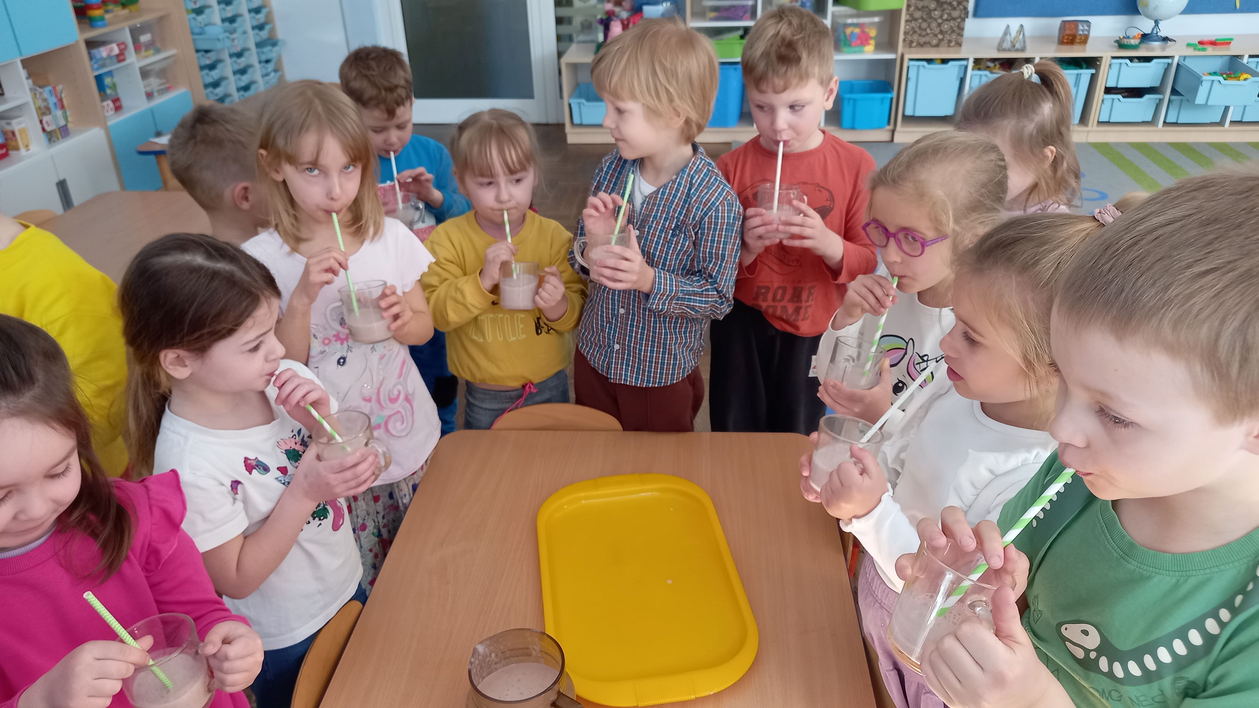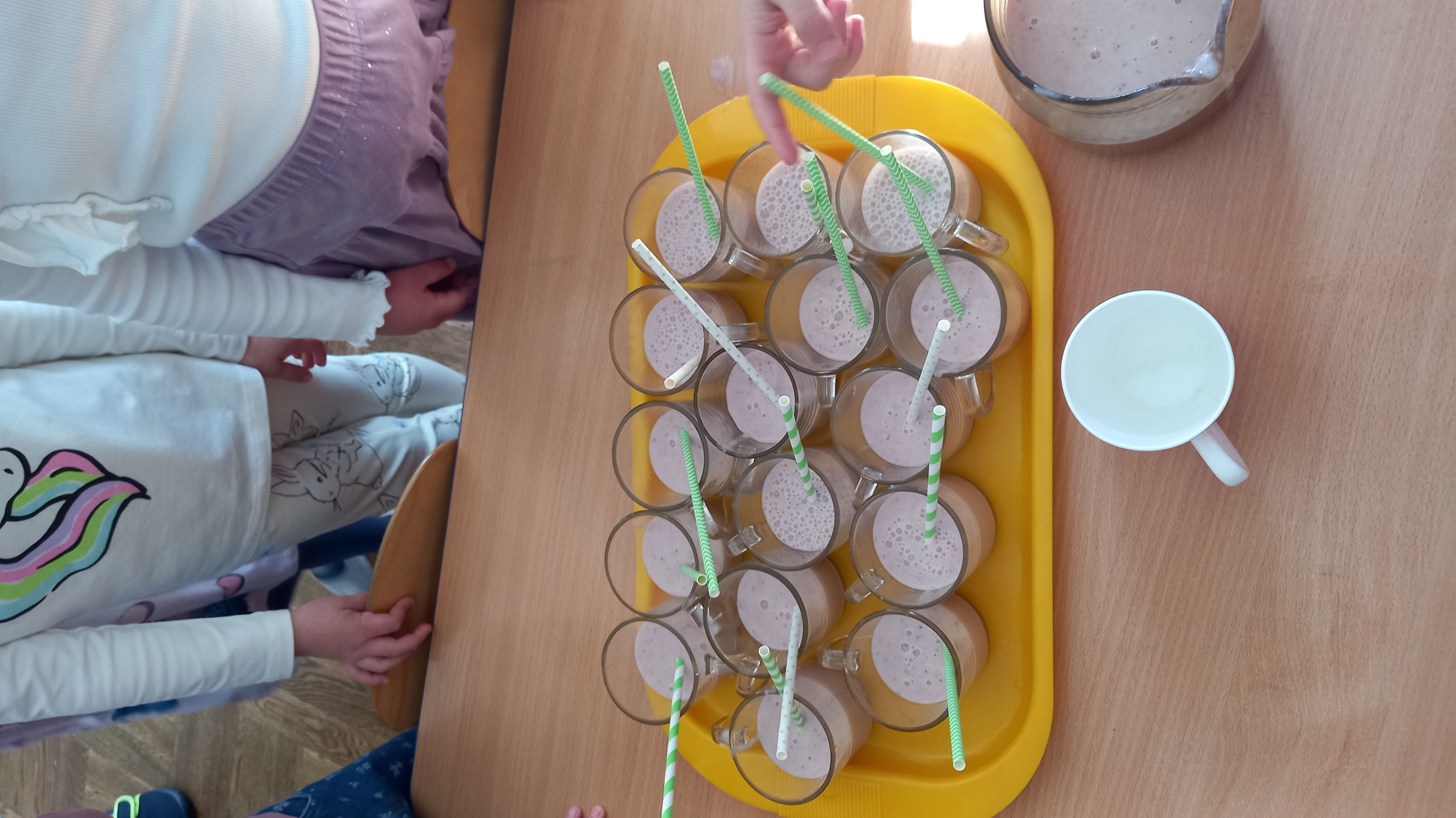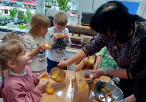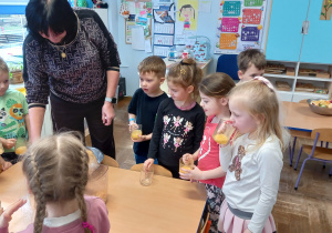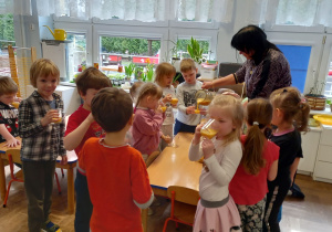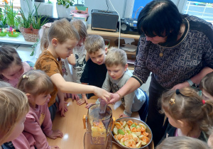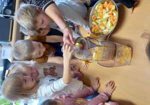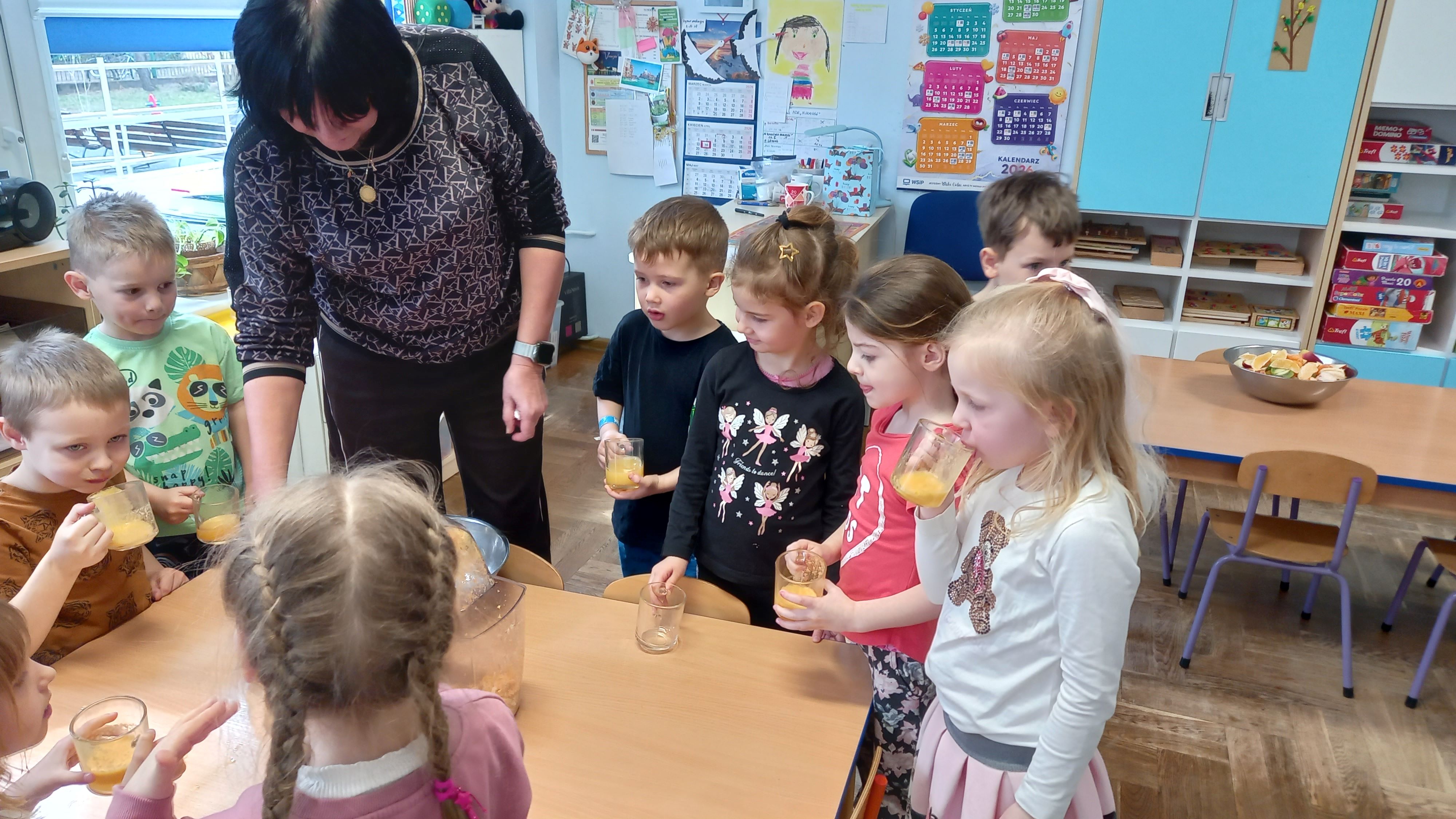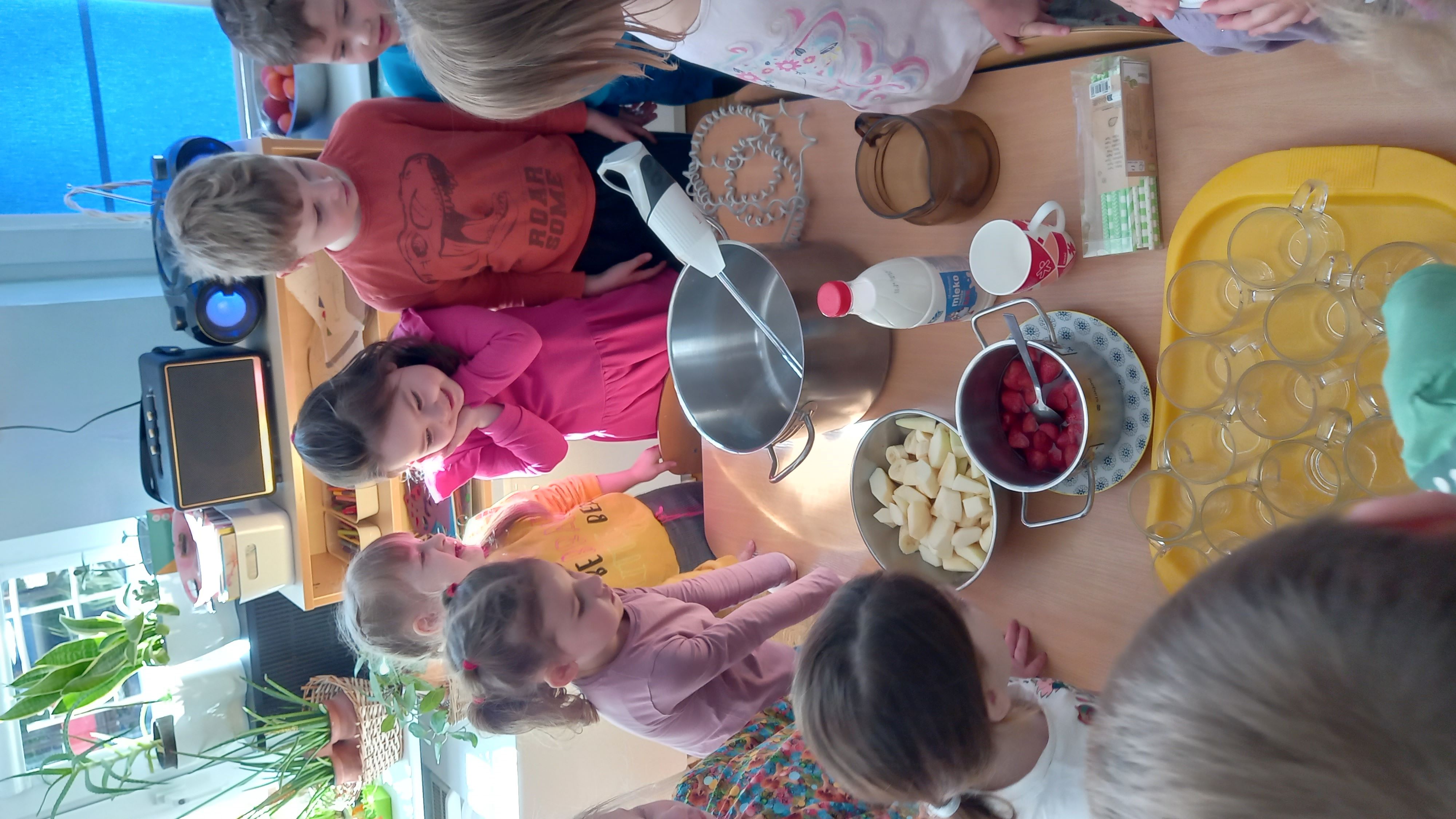 Największą atrakcją było jednak wspólne przygotowywanie świeżych soków owocowych. Z pomocą nauczycielki dzieci mogły obserwować cały proces - od wrzucania owoców do wyciskarki, po oglądanie jak powstaje pyszny sok. Kropelki chętnie pomagały, podawały składniki i z ogromnym zaciekawieniem patrzyły jak owoce zmieniają się w zdrowy napój.