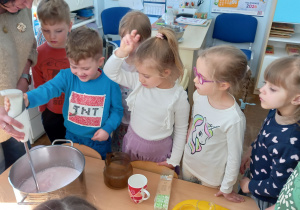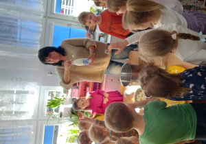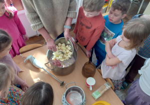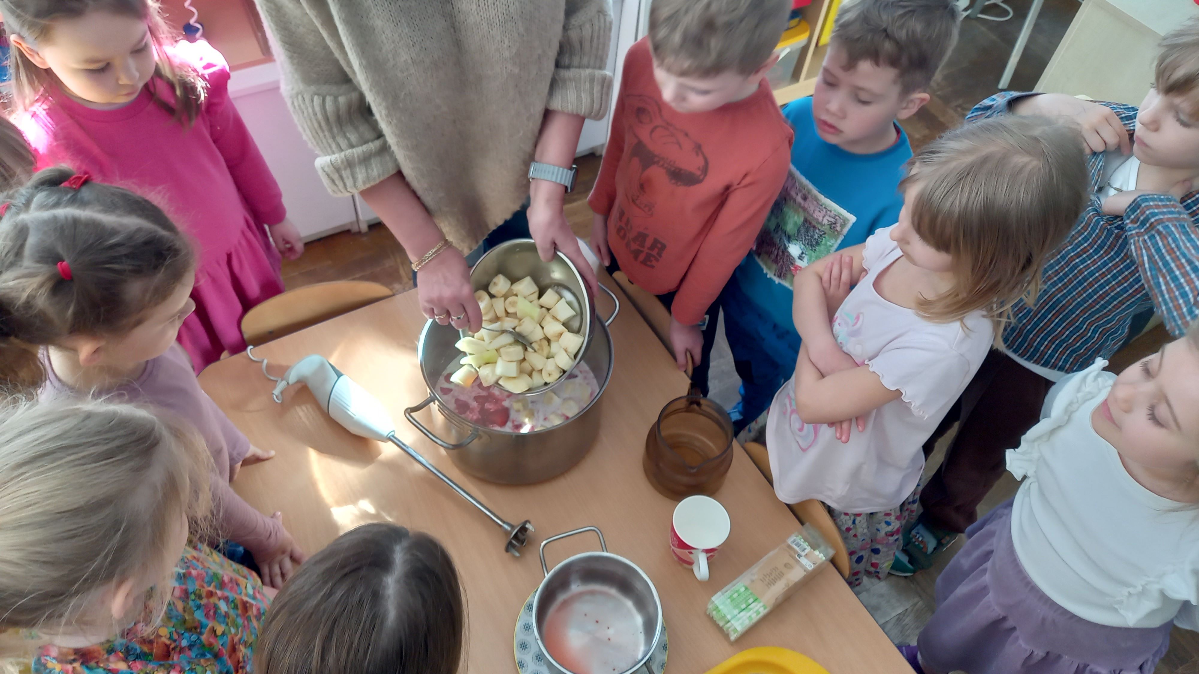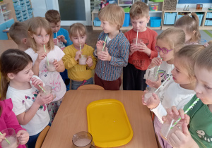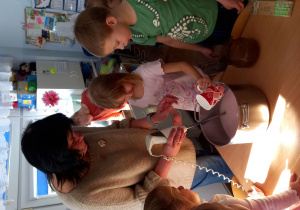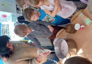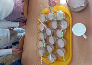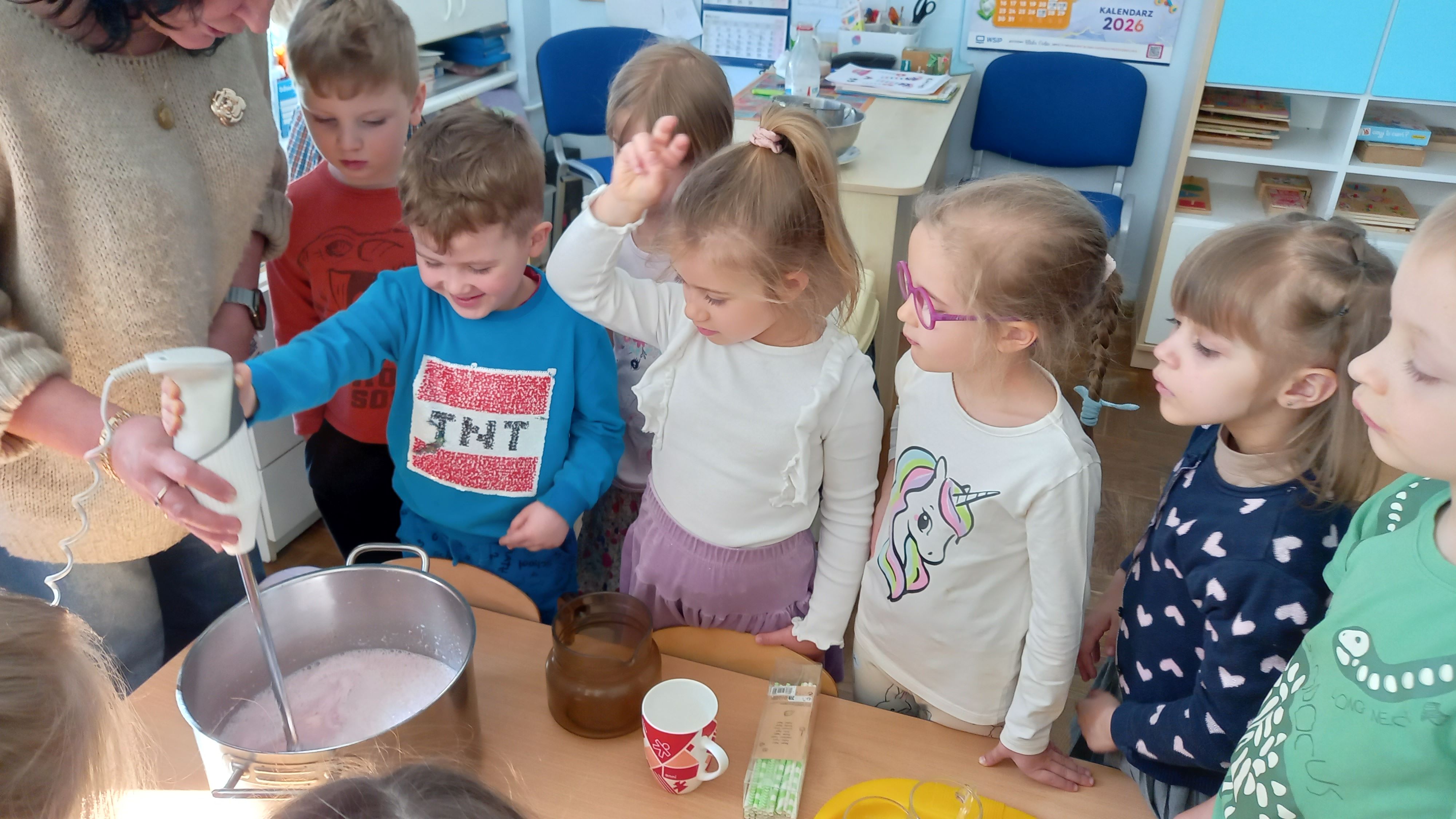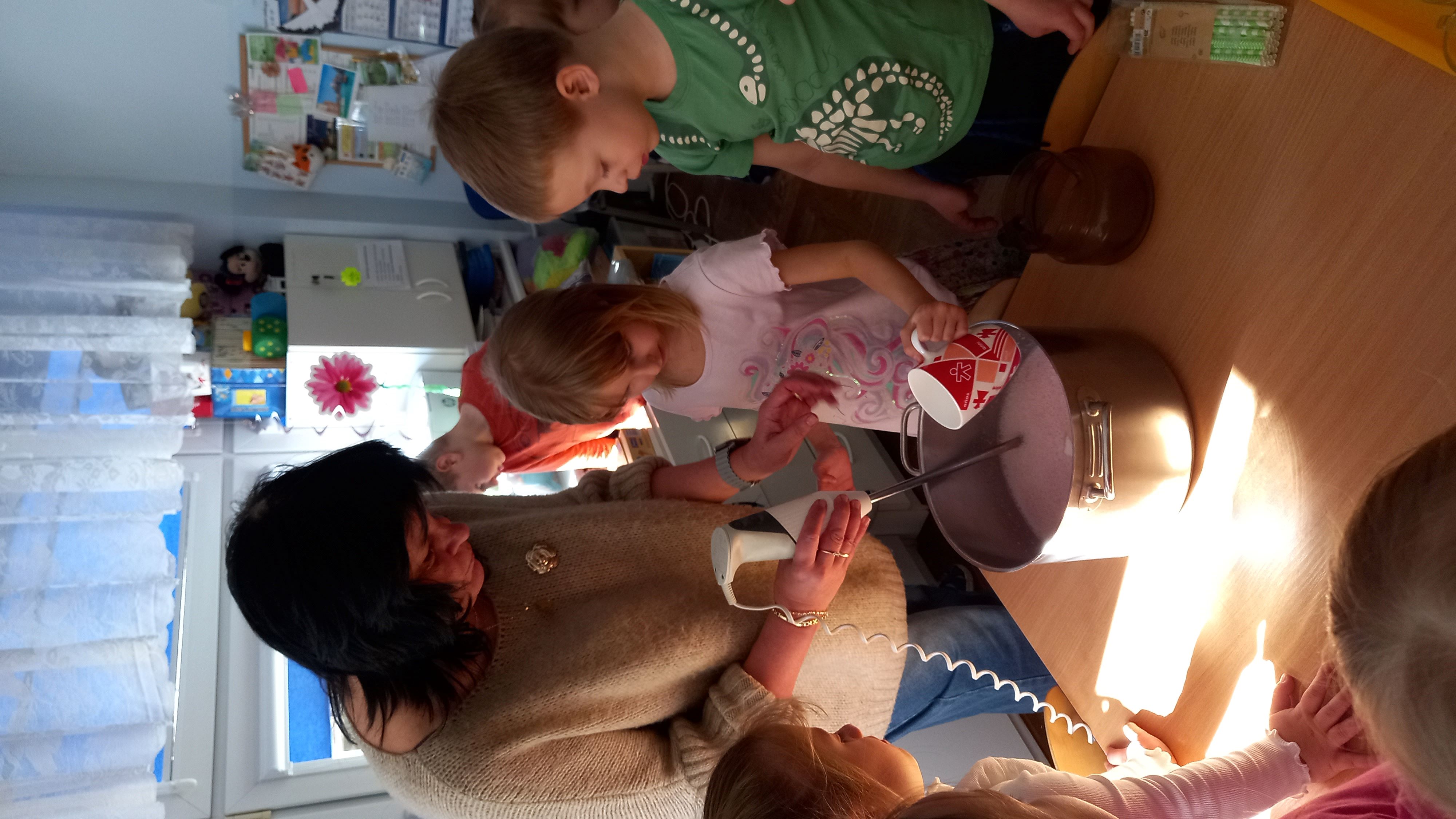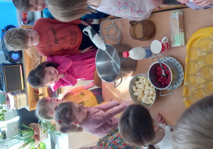 Największą atrakcją było jednak wspólne przygotowywanie świeżych soków owocowych. Z pomocą nauczycielki dzieci mogły obserwować cały proces - od wrzucania owoców do wyciskarki, po oglądanie jak powstaje pyszny sok. Kropelki chętnie pomagały, podawały składniki i z ogromnym zaciekawieniem patrzyły jak owoce zmieniają się w zdrowy napój.