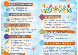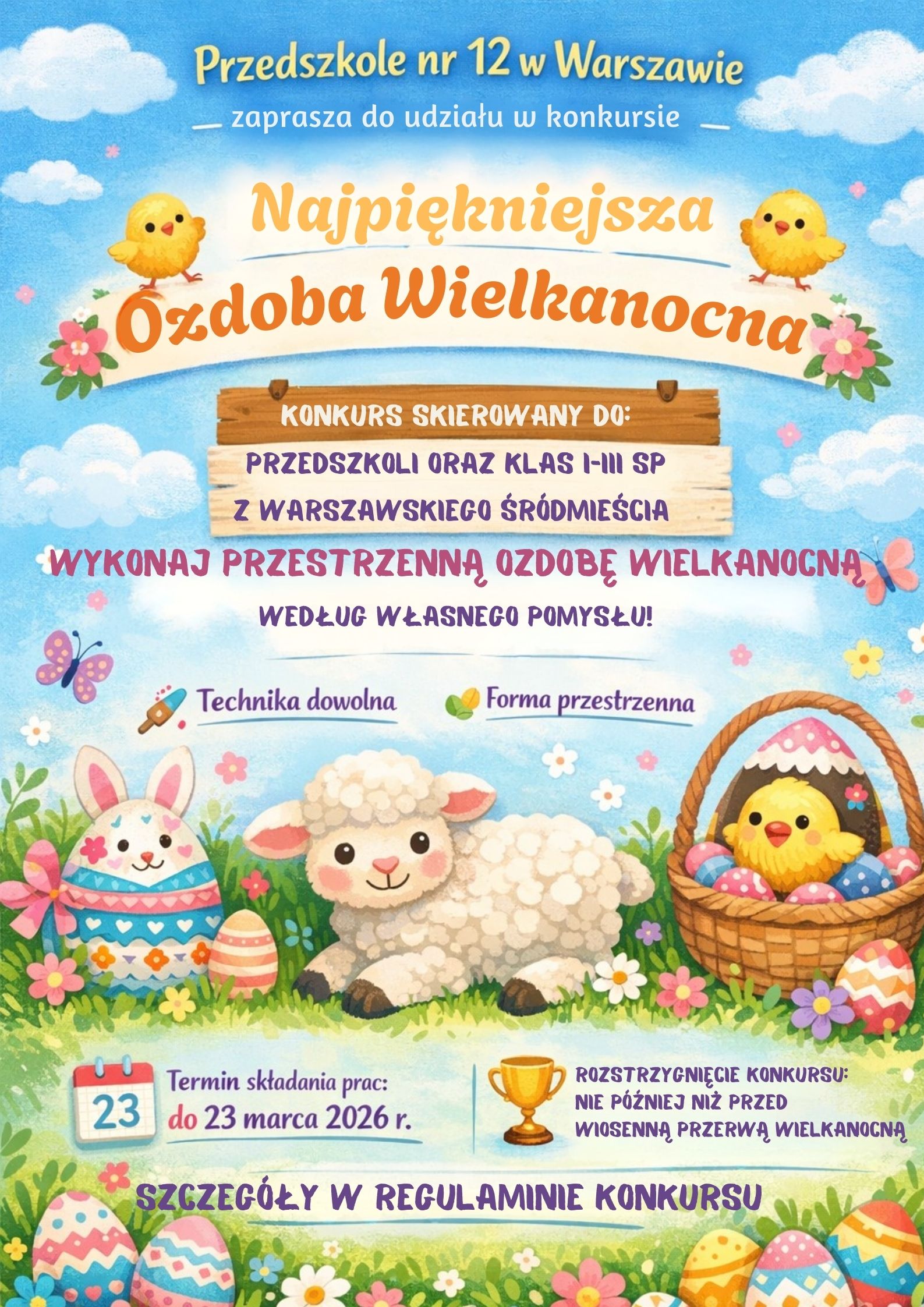 Gotowe prace prosimy przynosić do przedszkola do dnia 23 marca 2026 r. Szczegółowy regulamin konkursu oraz dodatkowe informacje znajdują się na dołączonej grafice.